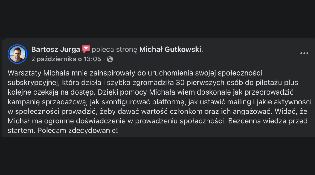 Zrozumiałem wtedy, że jedynie prowadzenie własnego biznesu da mi satysfakcje finansową oraz wolność i niezależność, której pragnąłem. Z czasem odkryłem Płatne Społeczności Subskrypcyjne i zrozumiałem, że to najlepszy model biznesowy dla twórców treści i edukatorów.